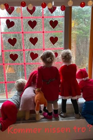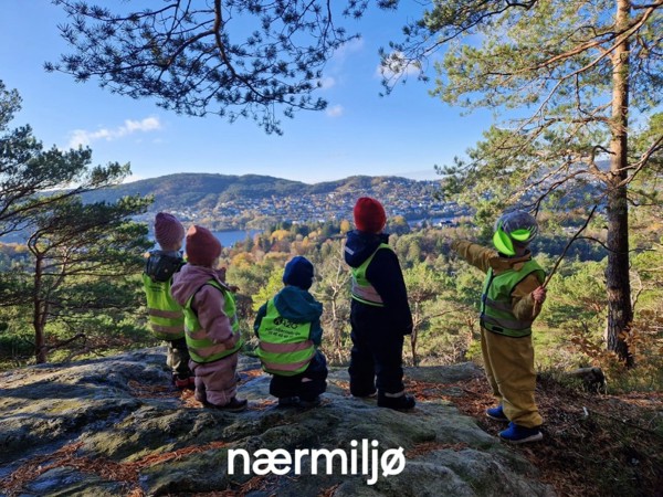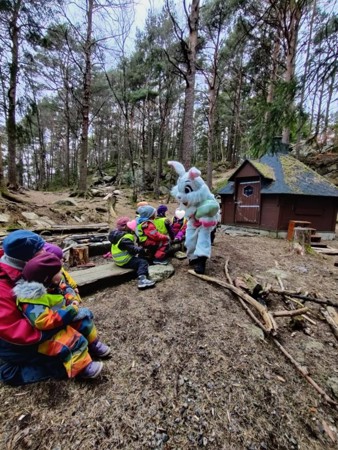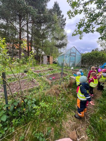 Vi ligger fint til med egen idyllisk skog, store ulente uteområder, kjøkkenhage og store, lyse lokaler.
